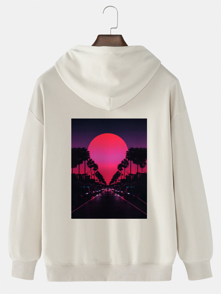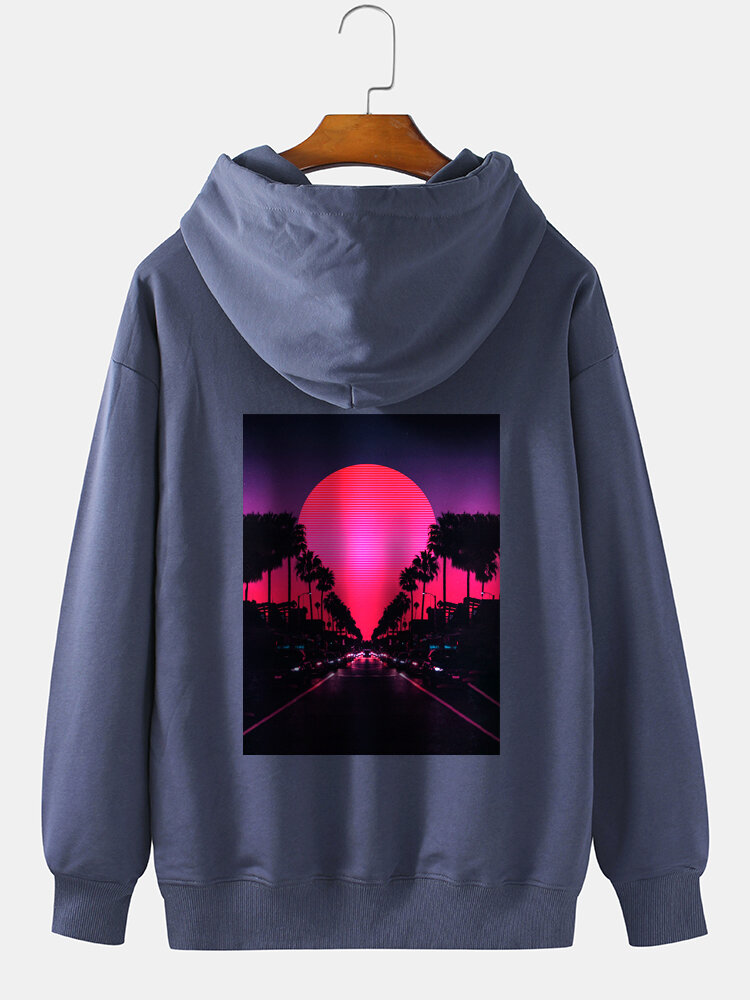Mens Sunset Scenery Graphic Back Print Solid Cotton Casual Pullover Hoodie – Khaki S