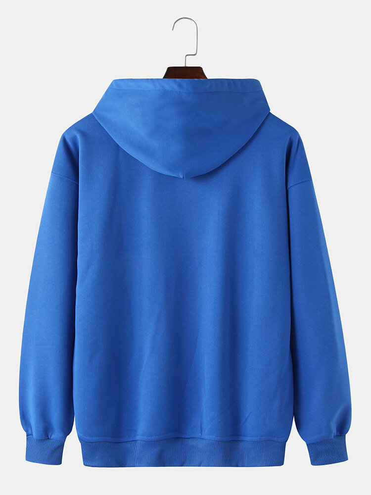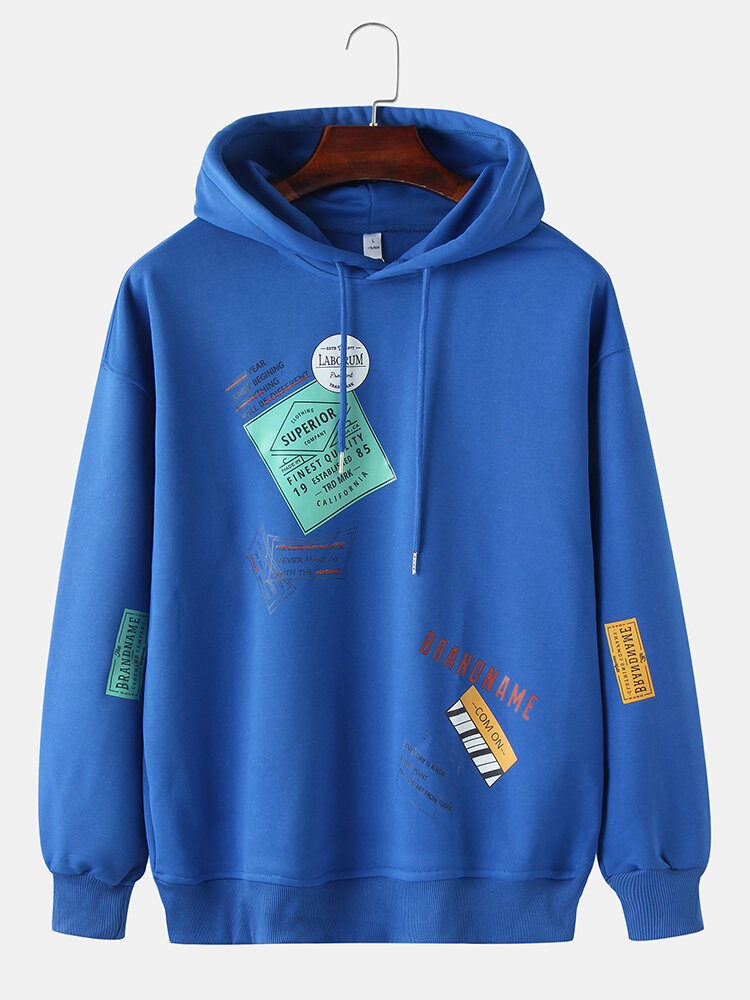 Mens Tab Print Simple DropShoulder Long Sleeve Drawstring Hoodies – Blue L