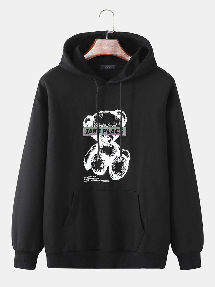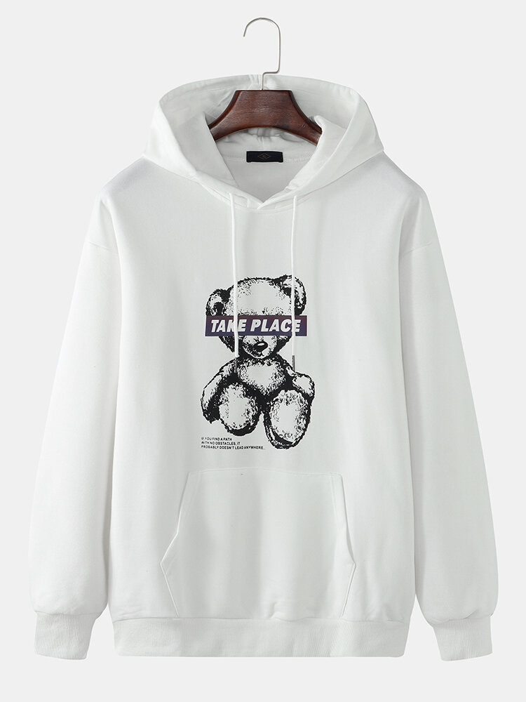 Mens Take Place Bear Graphic Print Casual Hoodie With Kangaroo Pocket – White L