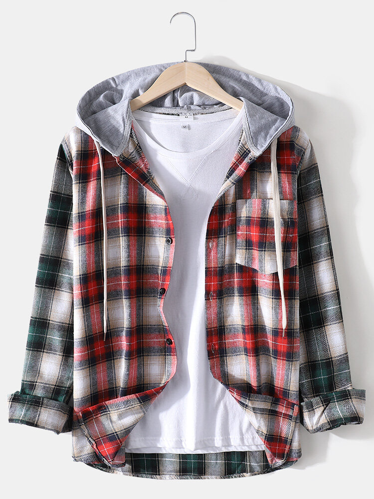 Decoration:Pocket,ButtonFit Type:Regular FitMaterial:CottonNeckline:HoodedPattern Type:Plaid,PatchworkScene:Leisure,CasualSeason:Autumn,SpringSize:XXL,L,S,XL,MSleeve:Long SleeveStyle:CasualThickness:Regular