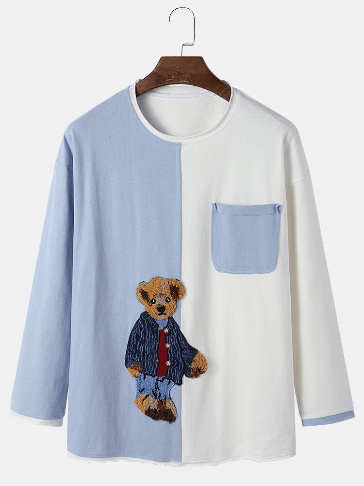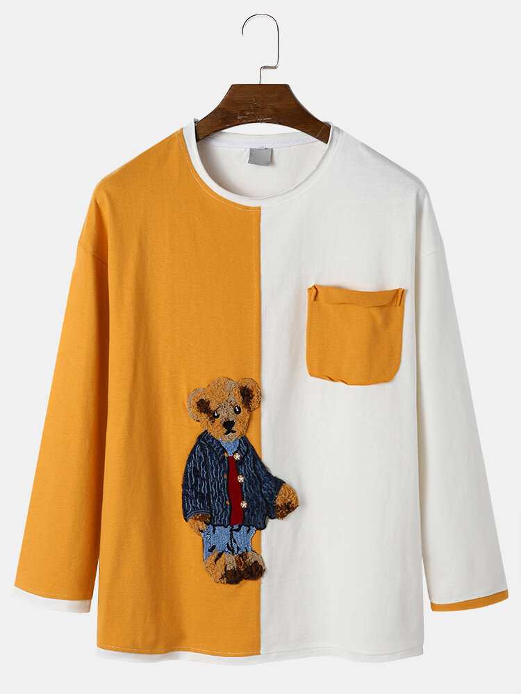 Mens Teddy Cartoon Printed Preppy Youngster Patchwork Top T-Shirt – Coffee XL