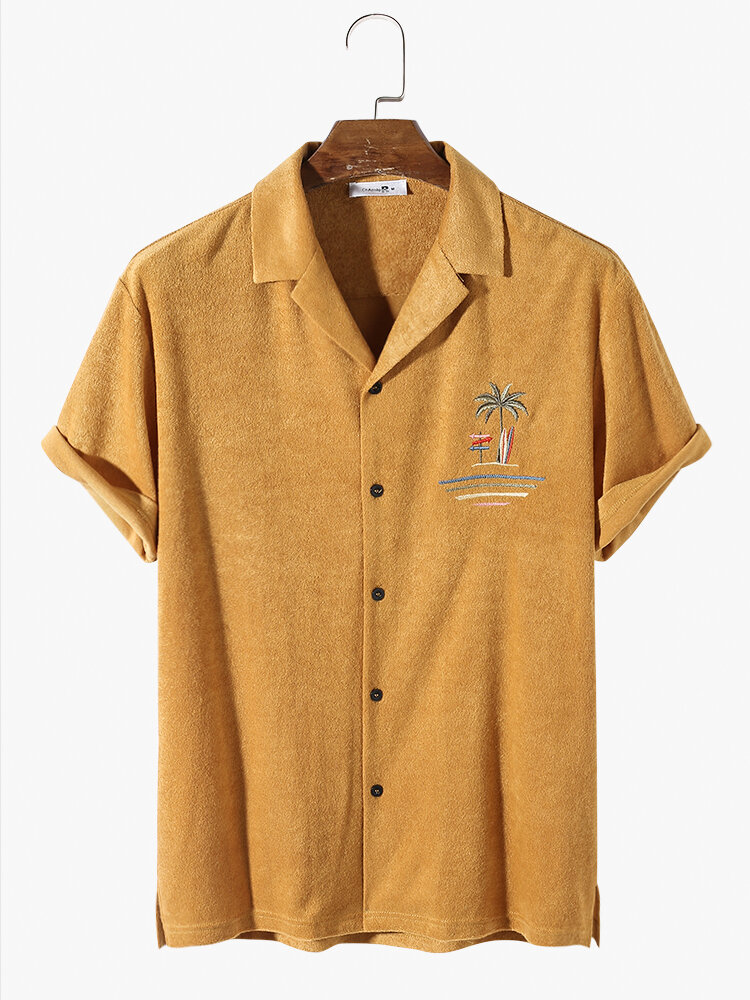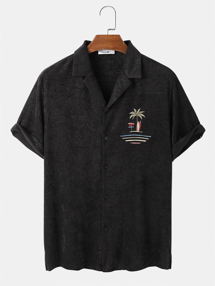 Mens Terry Cloth Towel Palm Tree Embroidery Cabana Shirts – Black S