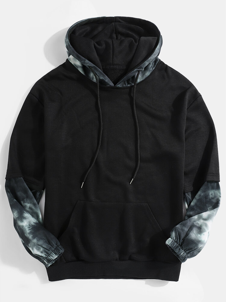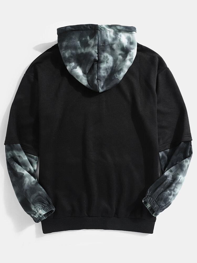 Mens Tie Dye Print Patchwork Doctor Sleeve Cotton Kangaroo Pocket Drawstring Hoodies – Black S