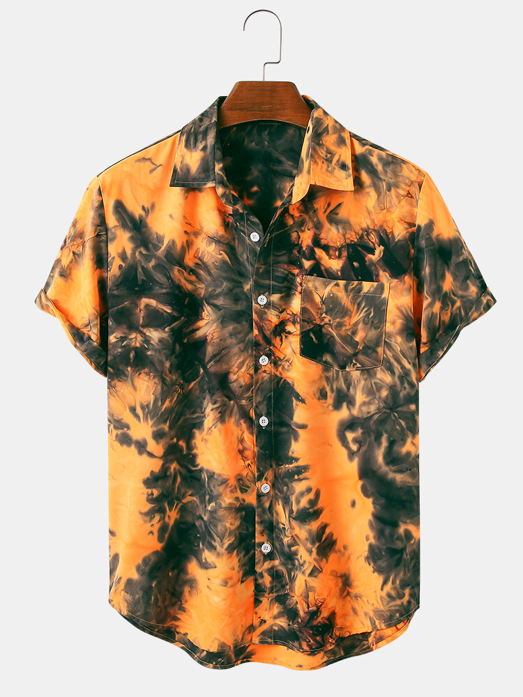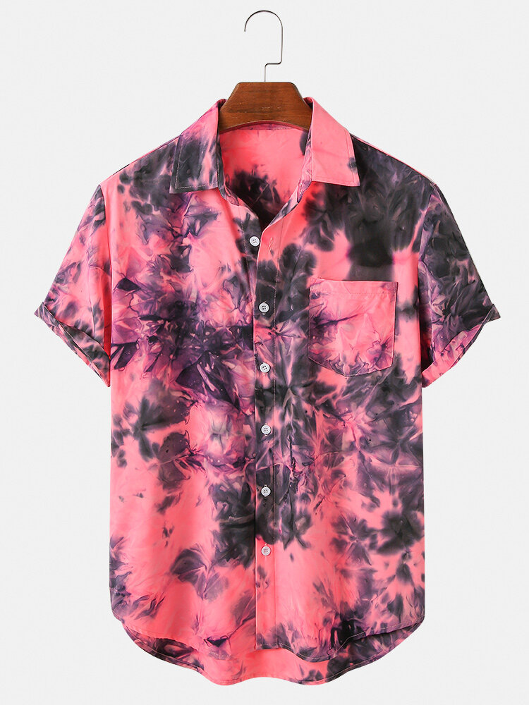 Mens Tie-dye Print Turn Down Collar Short Sleeve Shirts – Pink M