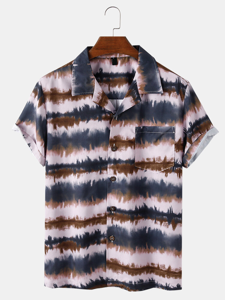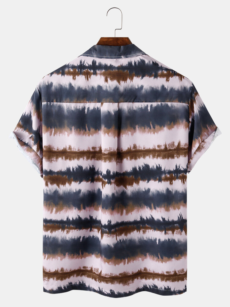 Mens Tie Dye Striped Print Loose Light Casual Short Sleeve Shirts – Black XL