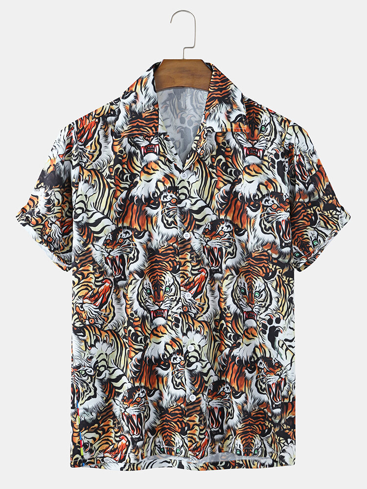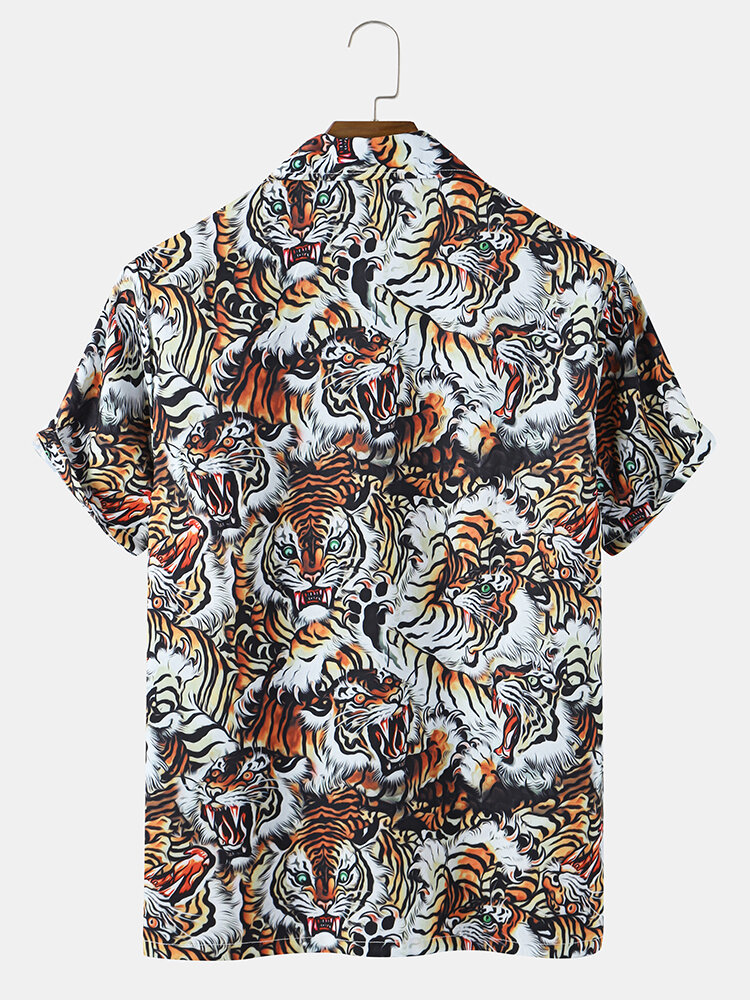 Mens Tiger Print Revere Collar Short Sleeve Shirts – Black 2XL