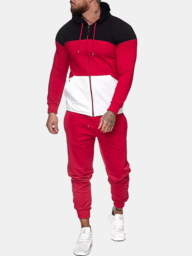 Mens Tricolor Patchwork Hoodie Jacket Drawstring Jogger Pants Sport Two Piece Set – Green S