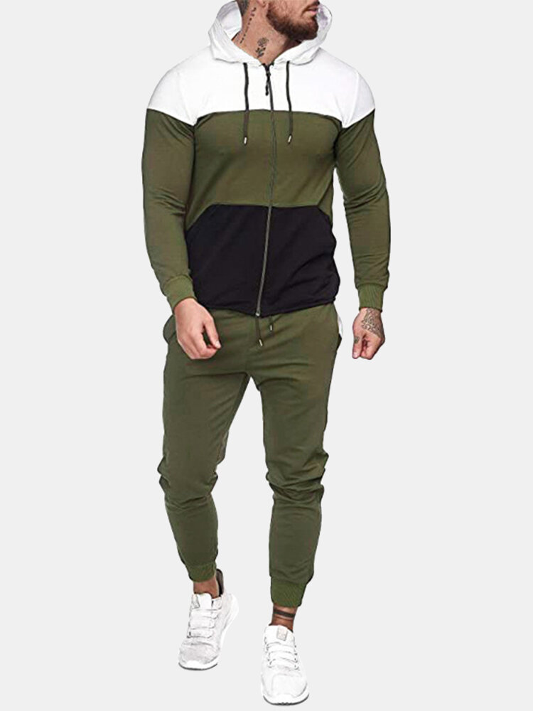 Mens Tricolor Patchwork Hoodie Jacket Drawstring Jogger Pants Sport Two Piece Set – Green S
