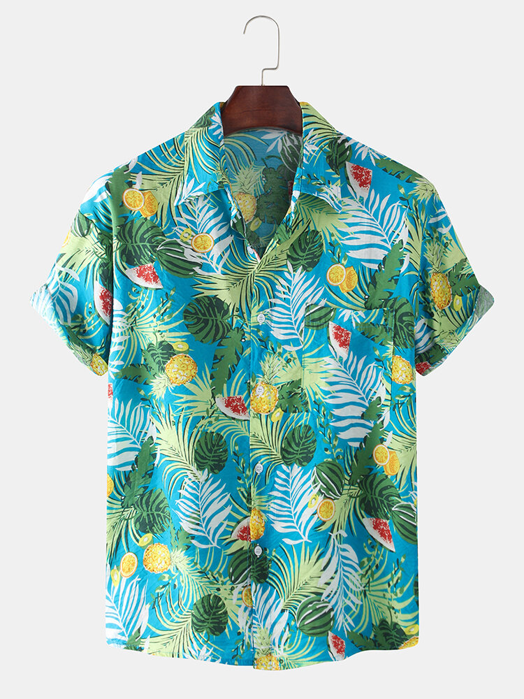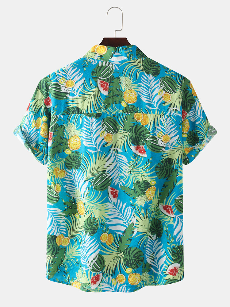 Mens Tropical Fruit Printed Casual Loose Lapel Short Sleeve Shirts – Blue S