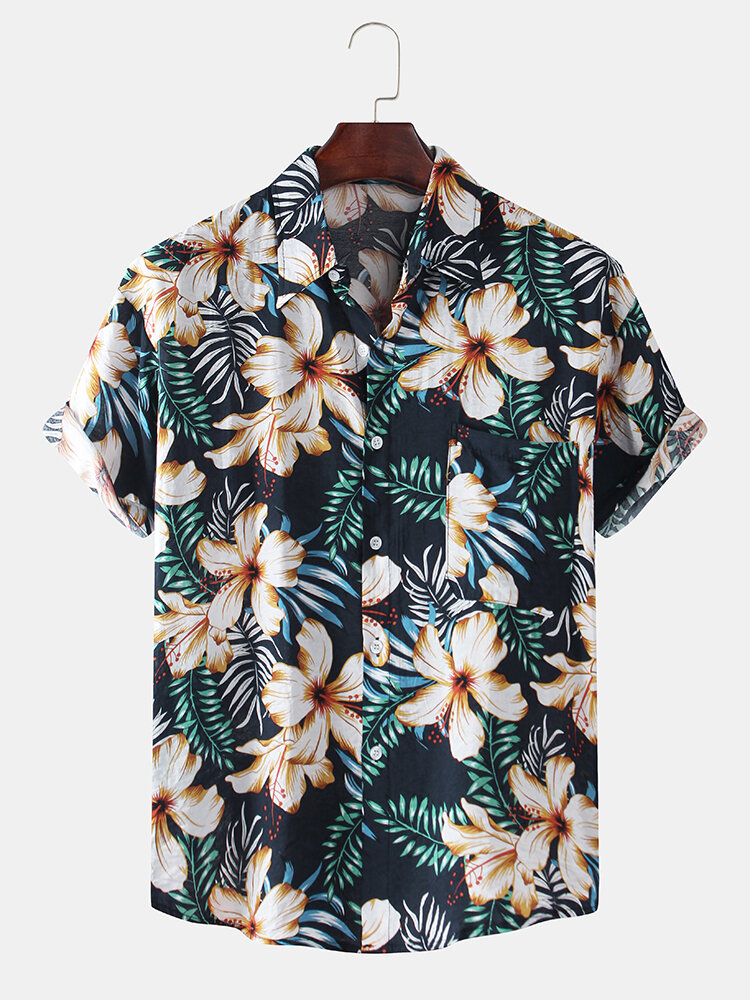 Mens Tropical Plants Floral Printed Casual Holiday Short Sleeve Shirts – Black S