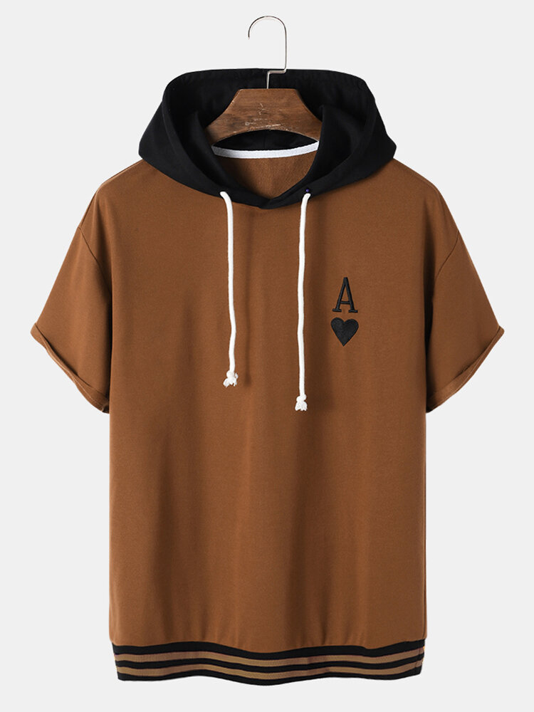 Mens Two Tone A Poker Embroidery Patchwork Drop Shoulder Casual Hooded T-Shirts – Brown 2XL