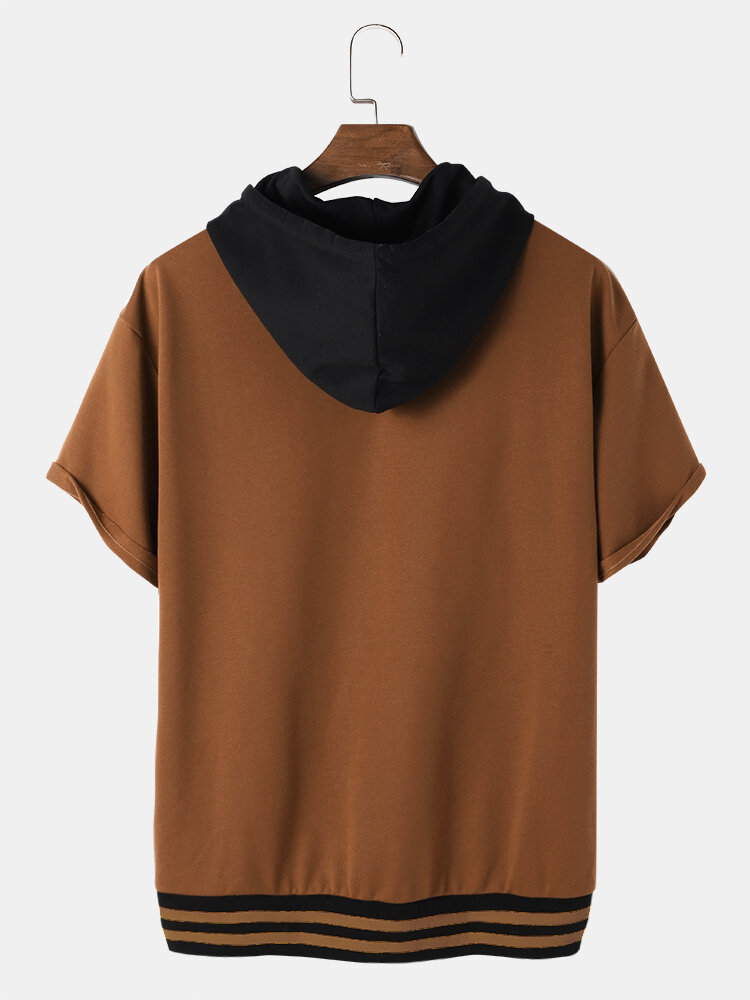 Mens Two Tone A Poker Embroidery Patchwork Drop Shoulder Casual Hooded T-Shirts – Brown 2XL