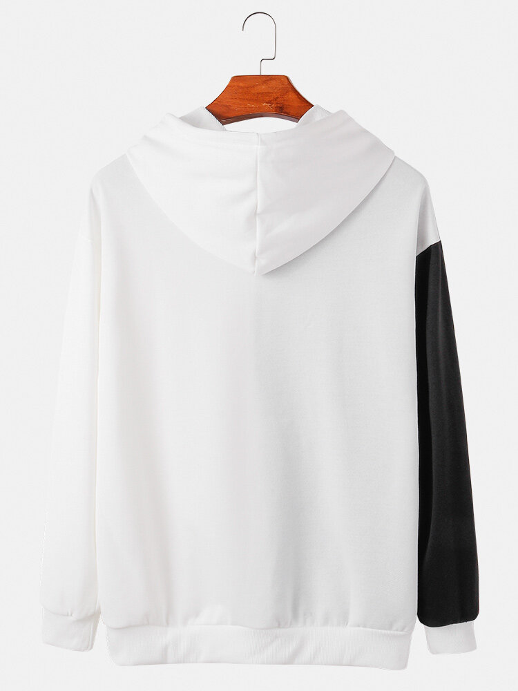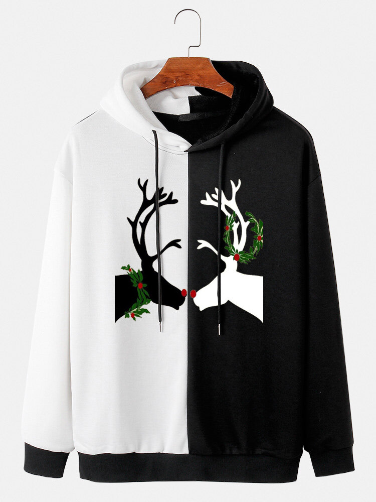 Mens Two Tone Patchwork Elk Head Print Casual Drawstring Hoodies – Black M