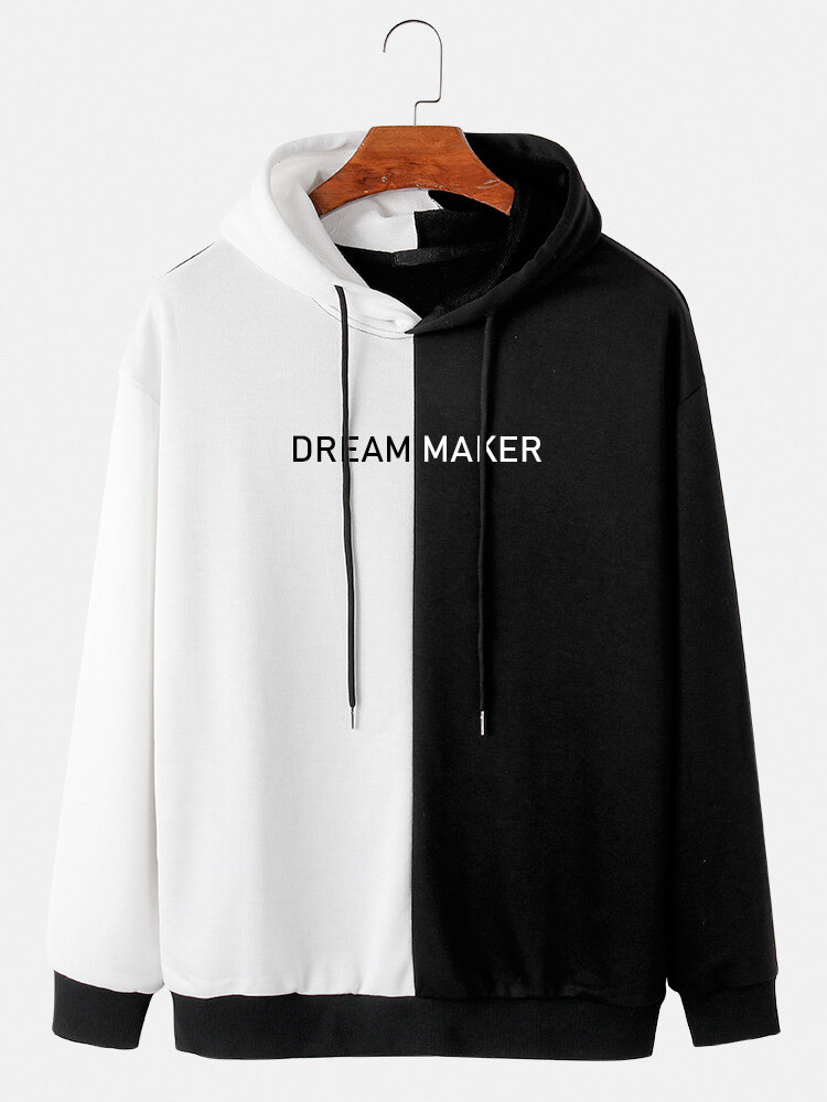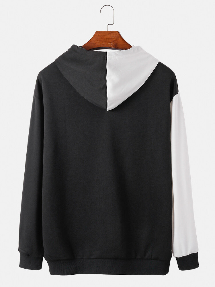 Mens Two Tone Patchwork Slogan Printed Cotton Casual Drawstring Hoodies – S Black