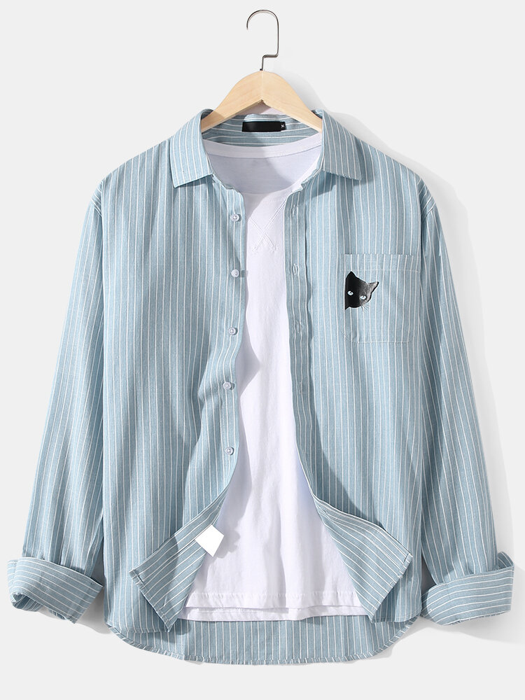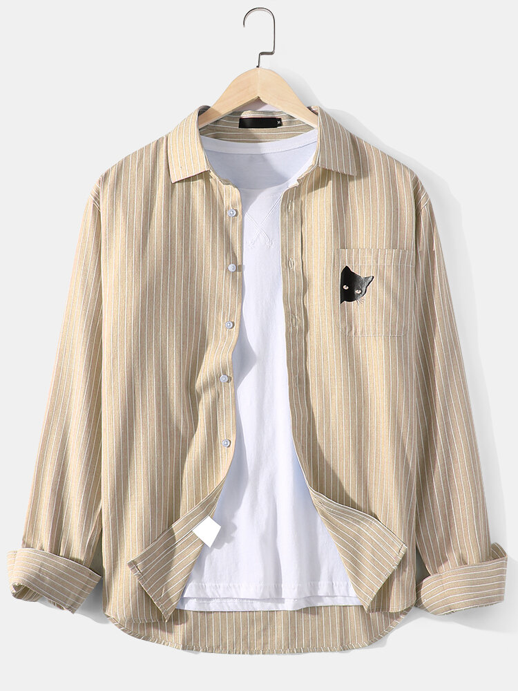 Mens Vertical Stripe Cat Print Cotton Linen Chest Pocket Long Sleeve Shirts – Green M