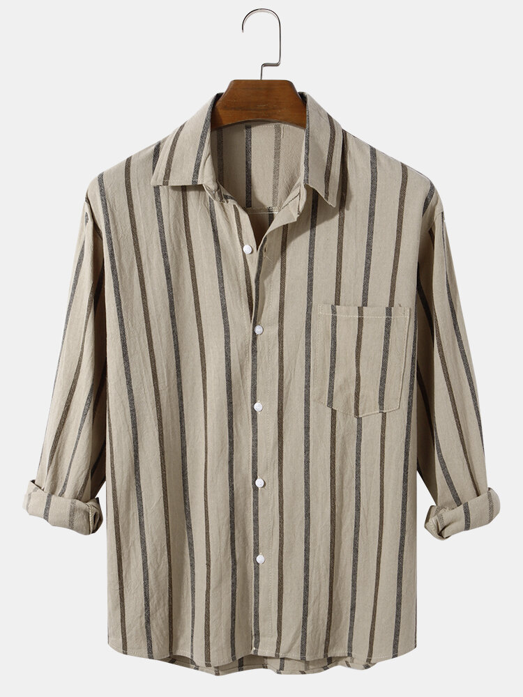Mens Vertical Stripe Cotton Relaxed Fit Button Up Long Sleeve Shirts With Pocket – Khaki S