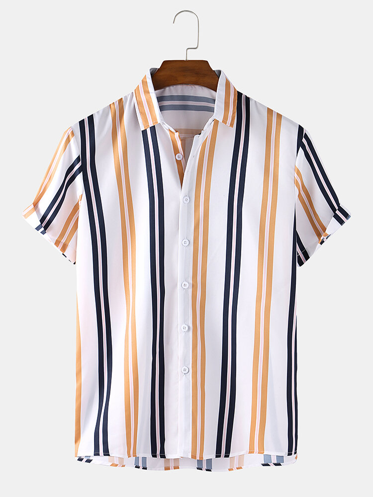 Mens Vertical Stripe Light Loose Casual Short Sleeve Shirts – Orange L