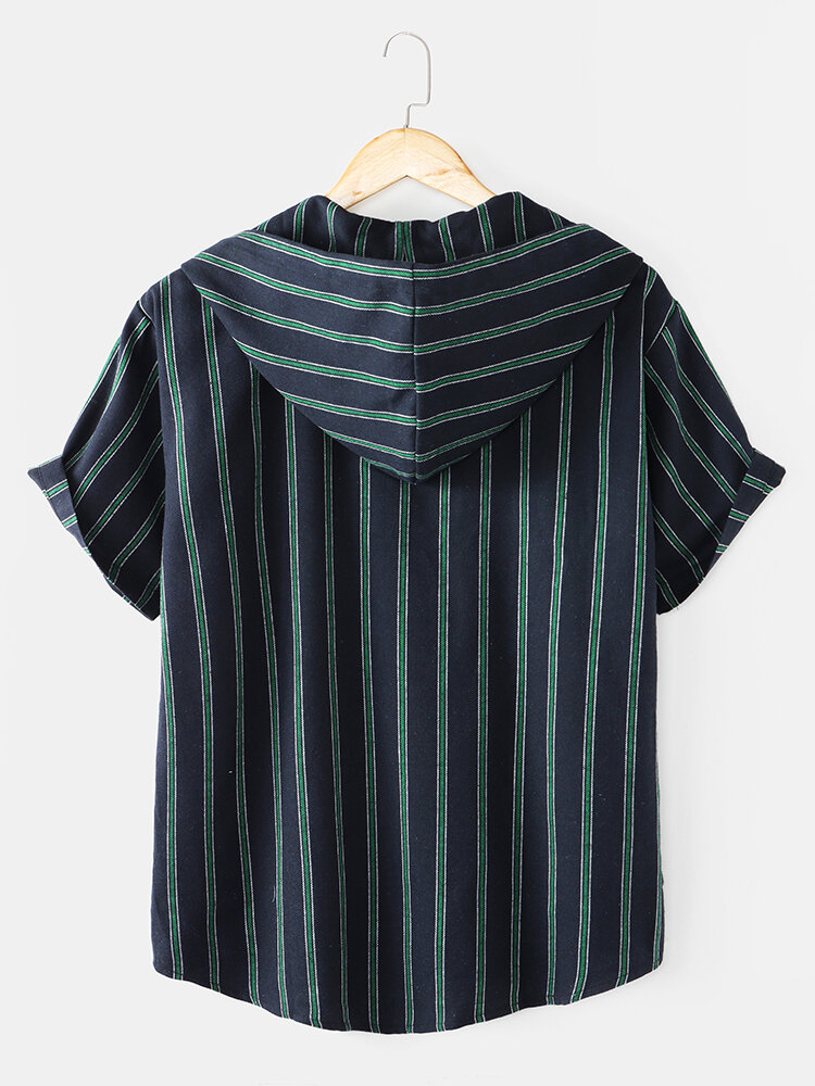 Mens Vertical Striped Short Sleeve Casual Hooded Shirts – Black S