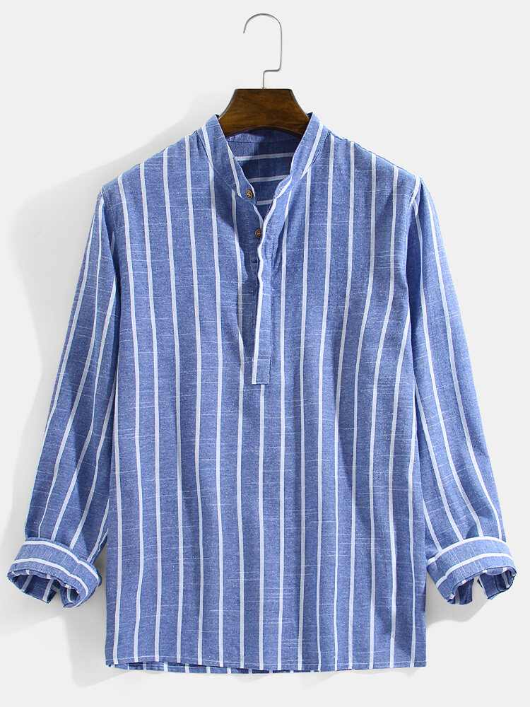 Mens Vertical Striped Stand Collar Cotton Casual Long Sleeve Henley Shirts – White S