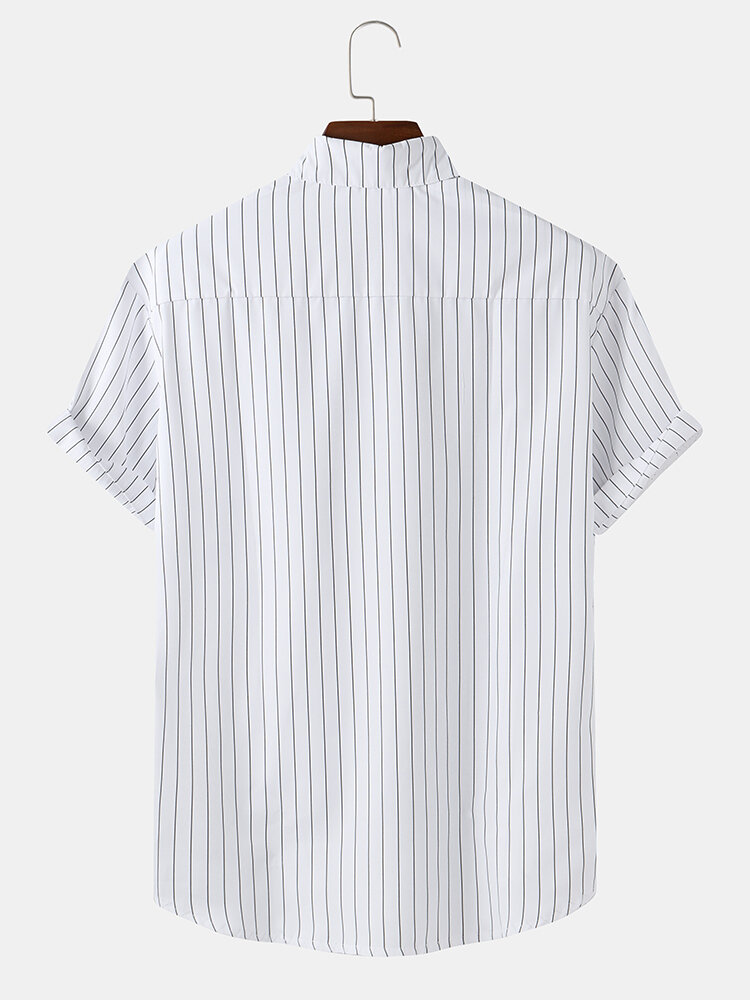 Mens Vertical Stripes Big Pocket Short Sleeve Casual Shirts – White 2XL