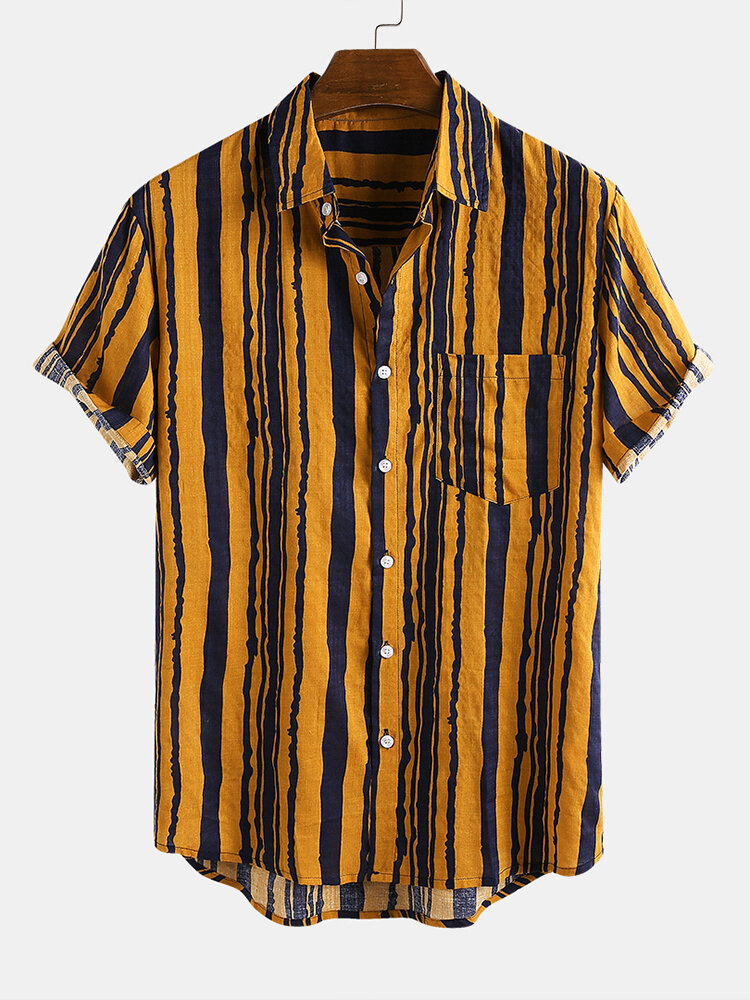 Description:Item Type: ShirtsPattern Type: StripeGender: MenFit Type: FitStyle: Casual,FashionThickness: RegularCollar: Turn Down CollarSeason: SummerDecorations: PocketMaterial: 100% CottonSleeve Length: Short SleeveColor: YellowCuff Type: Shirt SleeveOccasion: Leisure,Home,Daylife