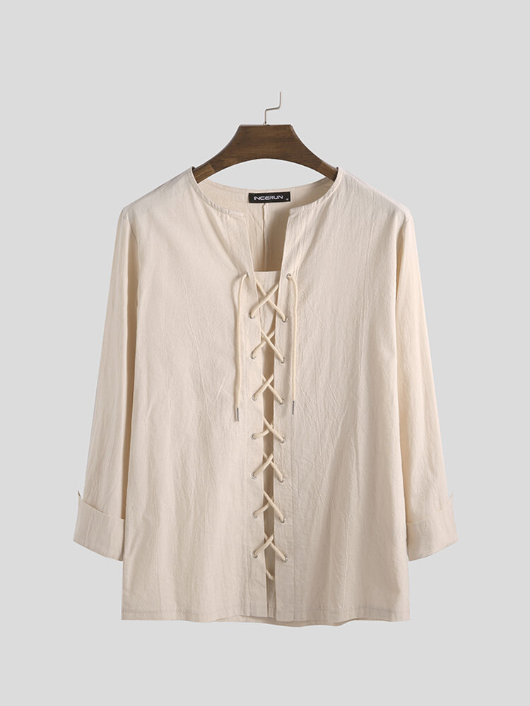 Mens Vintage Cotton Stand Collar Long Sleeve Loose Fit Casual T-Shirts – M Khaki