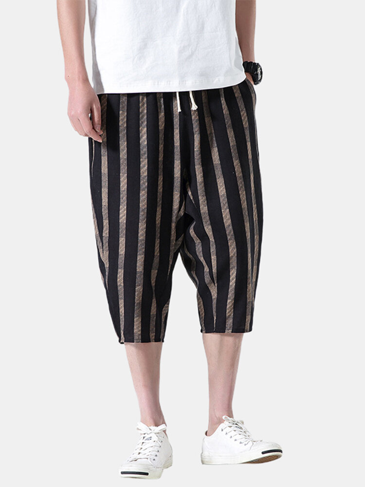 Mens Vintage Cotton Striped Drawstring Casual Calf Length Pants – Red S
