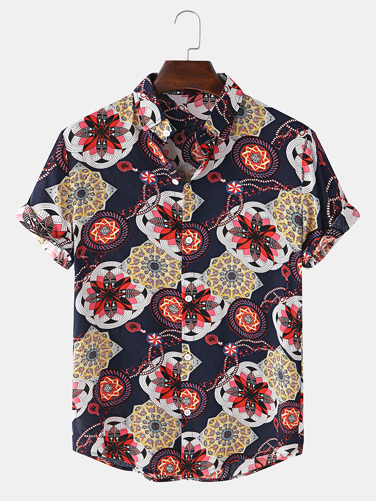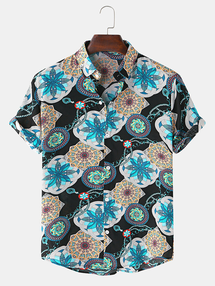 Mens Vintage Ethnic Abstract Print Shorts Sleeve Turn Down Collar Casual Shirts – Green M