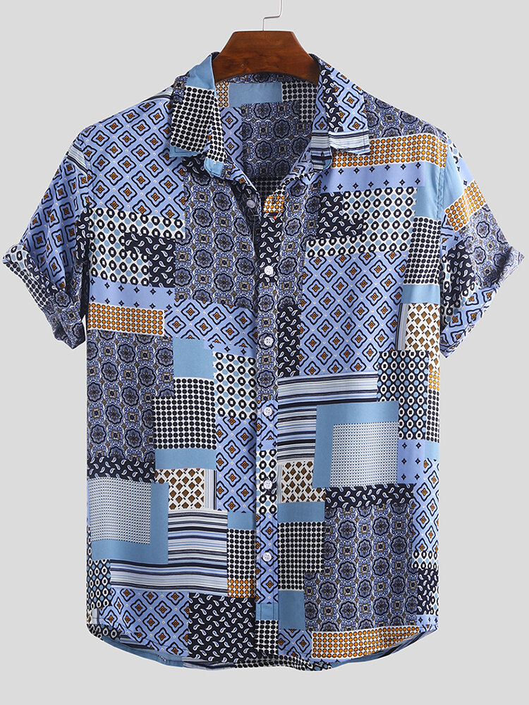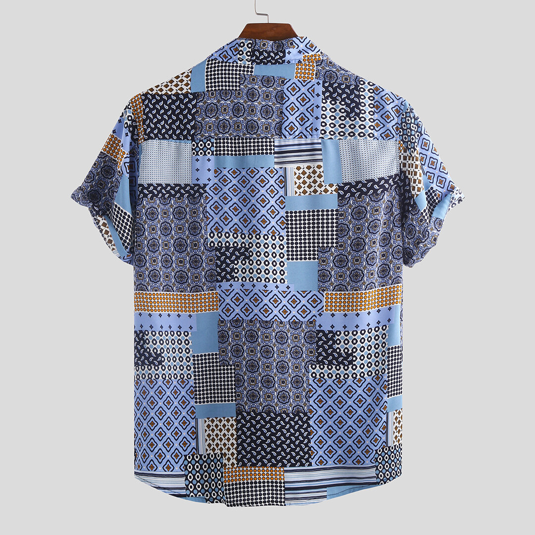 Mens Vintage Ethnic Pattern Patchwork Design Summer Shirts – L Blue