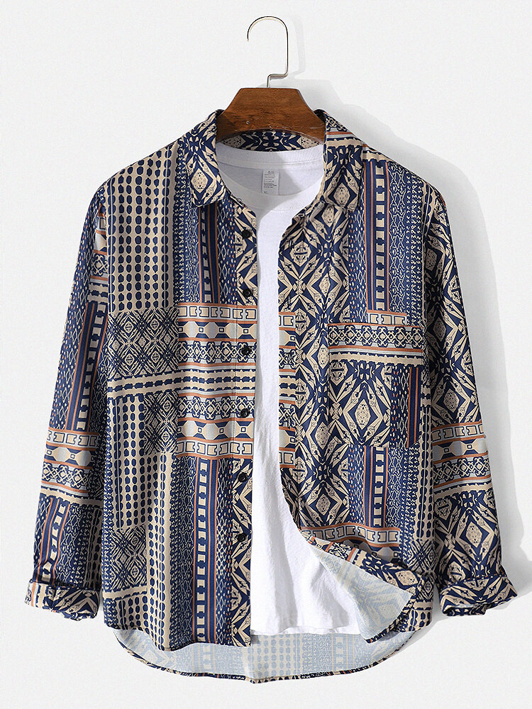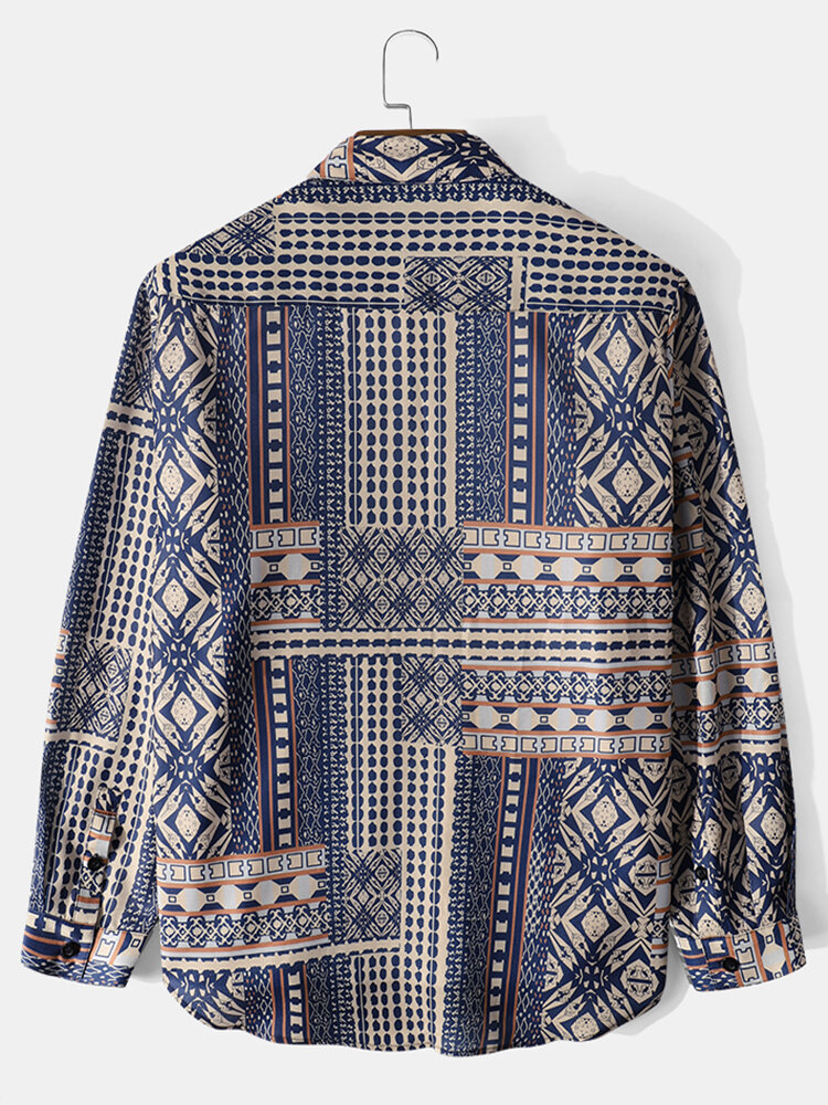 Mens Vintage Ethnic Pattern Print Lapel Long Sleeve Shirt – Navy 2XL