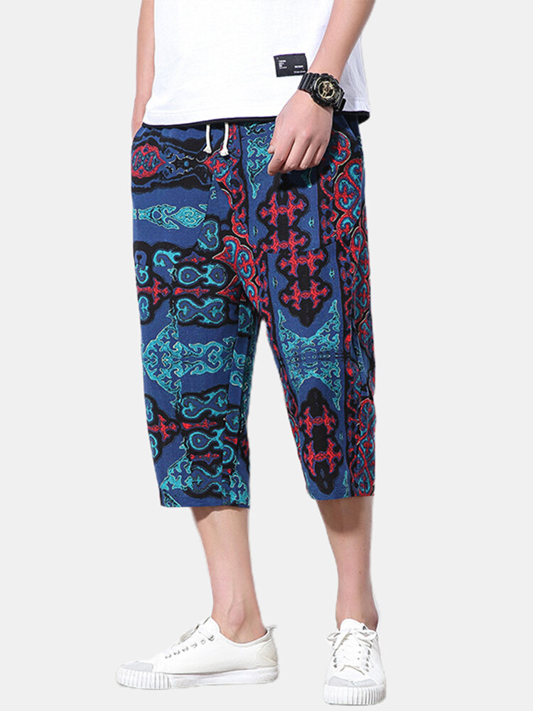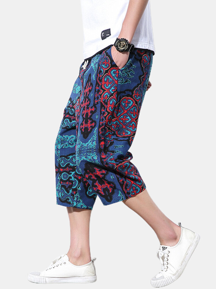 Mens Vintage Ethnic Print Loose Casual Calf-Length Drawstring Pants – Blue L