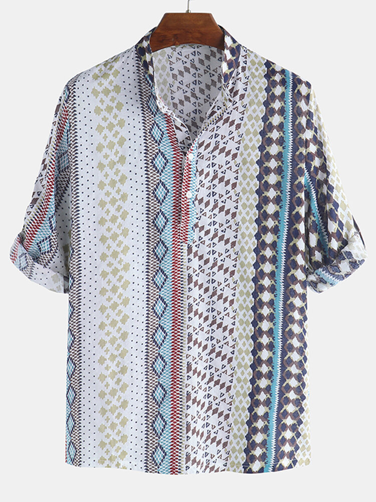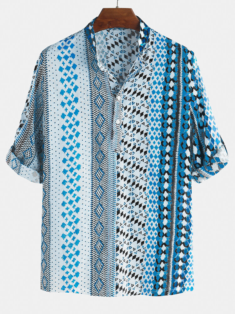 Brand: ChArmkpRPattern Type: Ethnic StyleItem Type: T-shirtFit Type: LooseGender: MenThickness: RegularStyle: Ethnic Style, VintageSeason: Spring, SummerCollar: Stand CollarWeight: 0.2kgMaterial: PolyesterColor: ColorfulCuff Type: Straight SleevesOccasion: Daily CasualSleeve Length: Half Sleeve Decoration: Pattern, Button