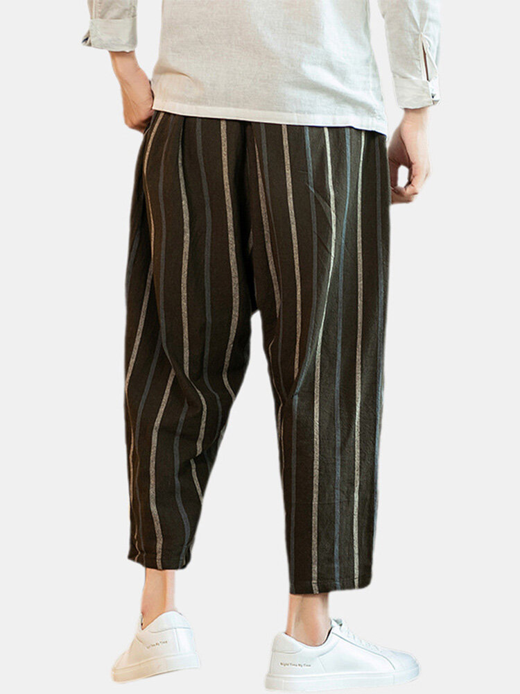 Mens Vintage Linen Stripe Elastic Waist Casual Pants – S Coffee