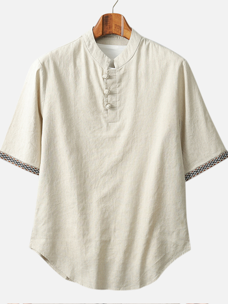 Mens Vintage Loose Buttons Stand Collar Short Sleeve Casual T-shirts – L Beige