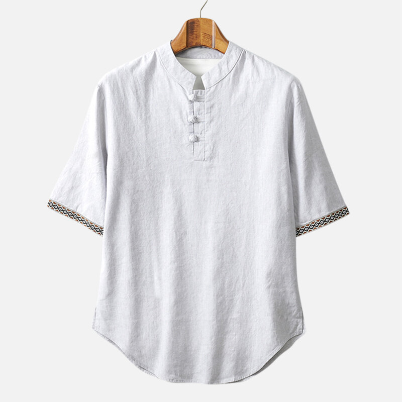 Item Type: ShirtsPattern Type: Solid ColorGender: MenFit Type: FitStyle: Casual, Classic, FashionThickness: RegularCollar: Stand CollarSeason: Spring, SummerMaterial: CottonColor: Navy, Light Gray, BeigeCuff Type: Straight SleevesOccasion: LeisureSleeve Length: Short Sleeve