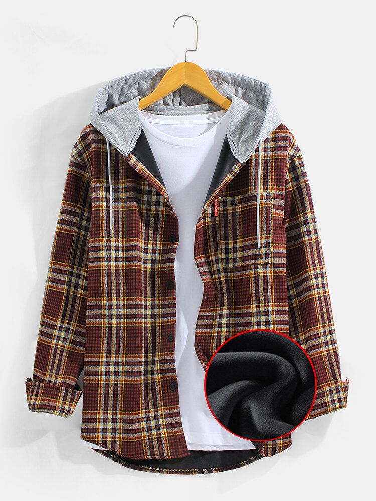 Mens Vintage Plaid Chest Pocket Warm Plush Lined Thick Long Sleeve Hooded Shirts – Red M