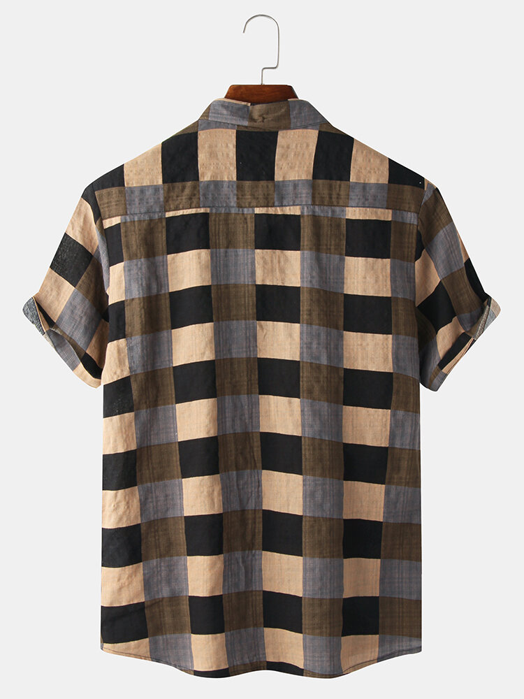 Decoration:Pocket,ButtonFit Type:Regular FitMaterial:Cotton,RayonNeckline:LapelPattern Type:PlaidScene:Leisure,CasualSeason:Spring,SummerSize:XXL,L,S,XL,MSleeve:Short SleeveStyle:Vintage,CasualThickness:Regular