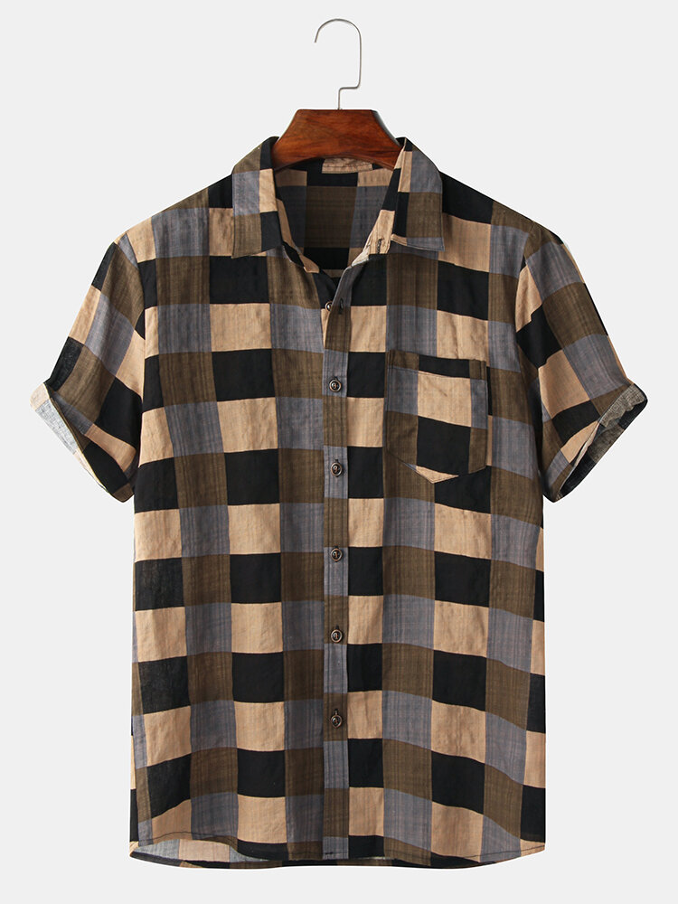 Mens Vintage Plaid Lapel Casual Short Sleeve Shirts With Pocket – Khaki S