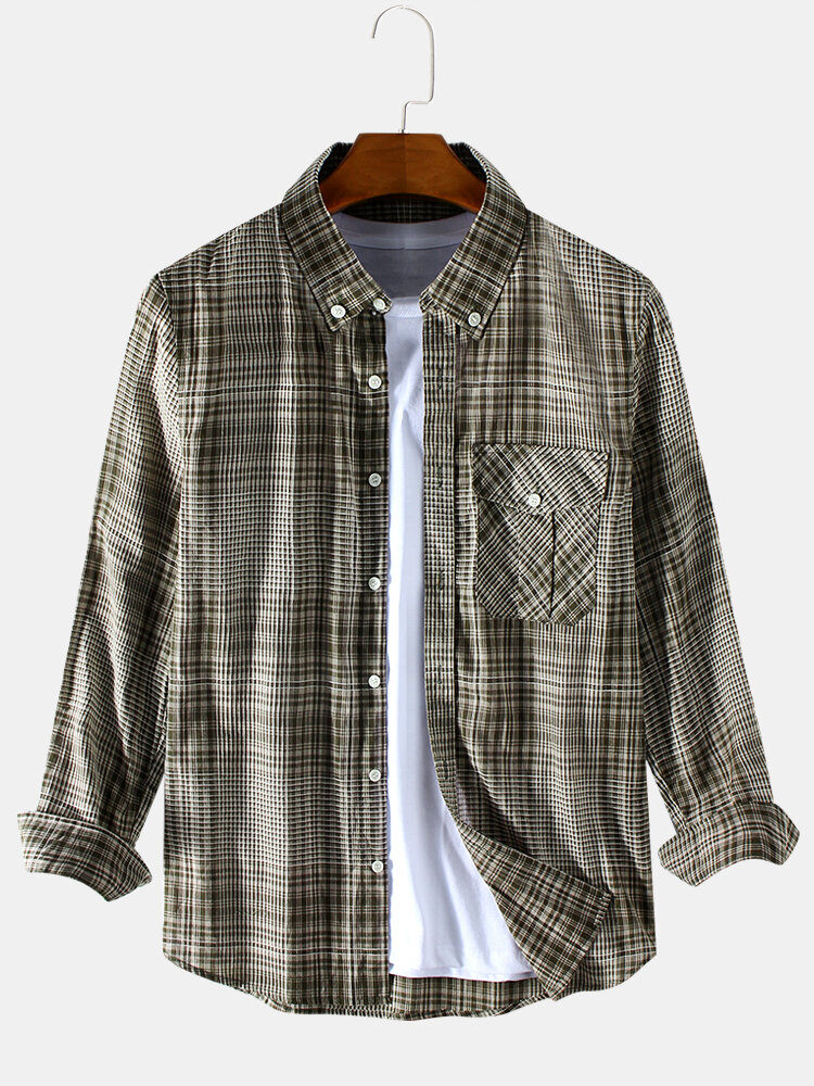 Mens Vintage Plaid Patvh Pocket Long Sleeve Causal Shirts – Khaki 3XL