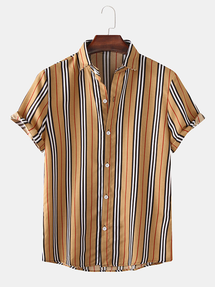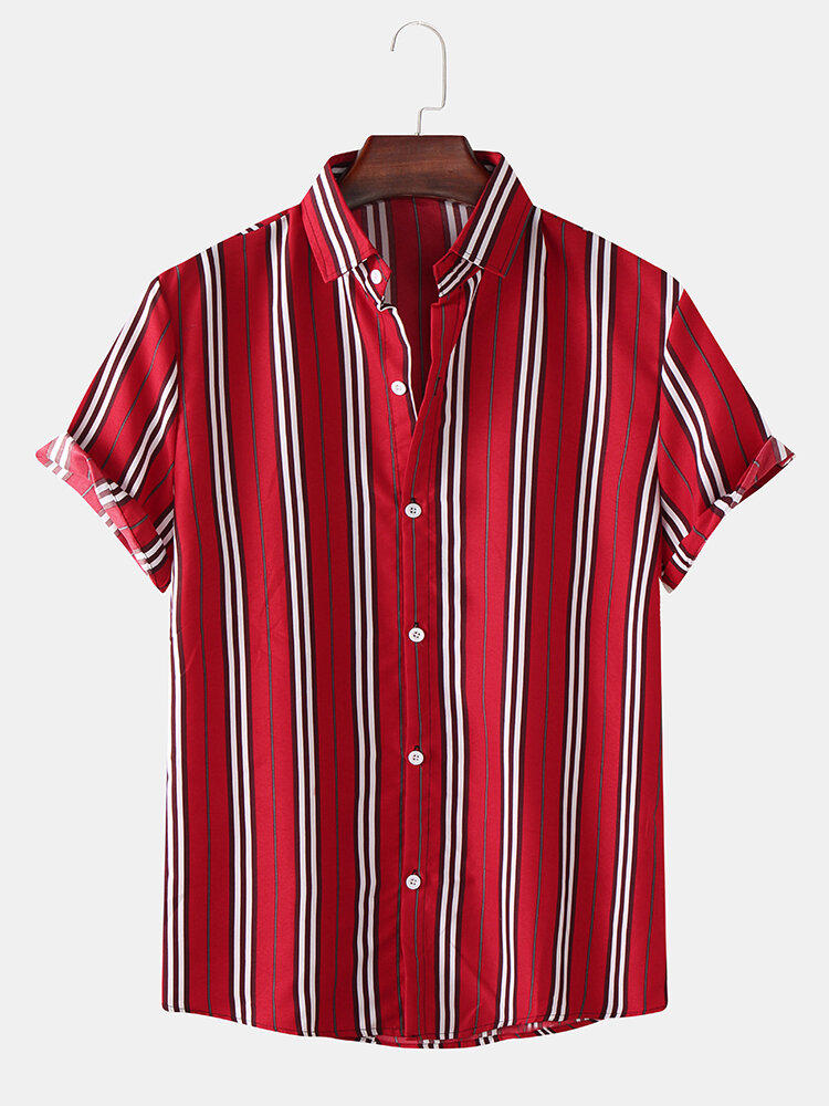 Mens Vintage Striped Breathable Short Sleeve Casual Shirts – Red S