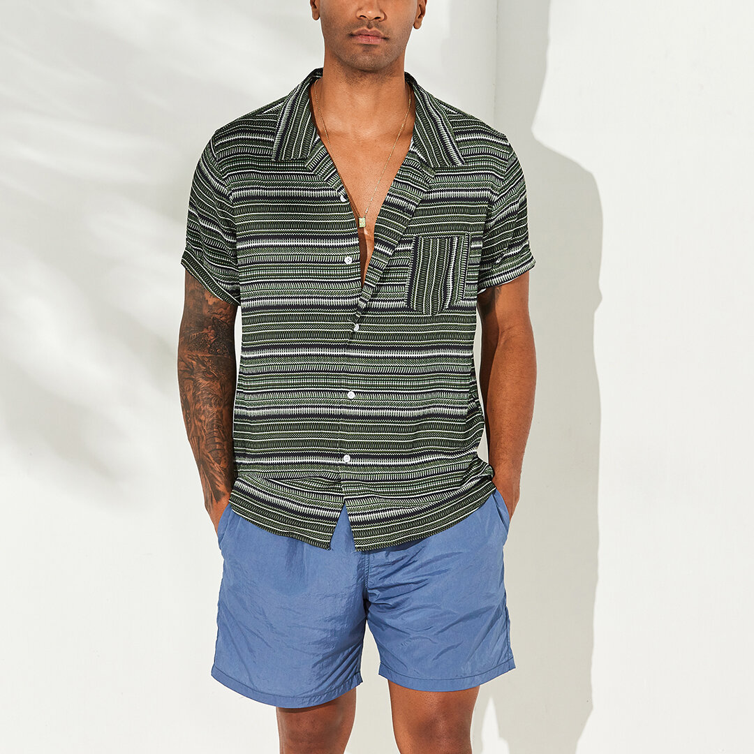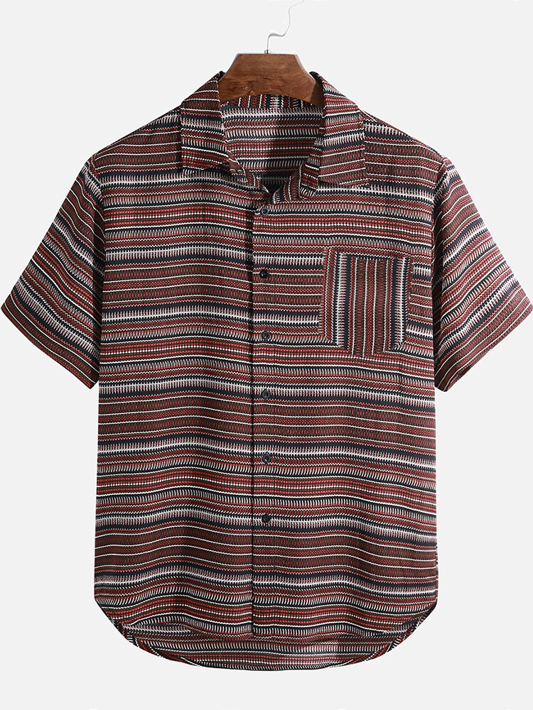 Mens Vintage Striped Chest Pocket Short Sleeve Loose Shirts – XL Purple