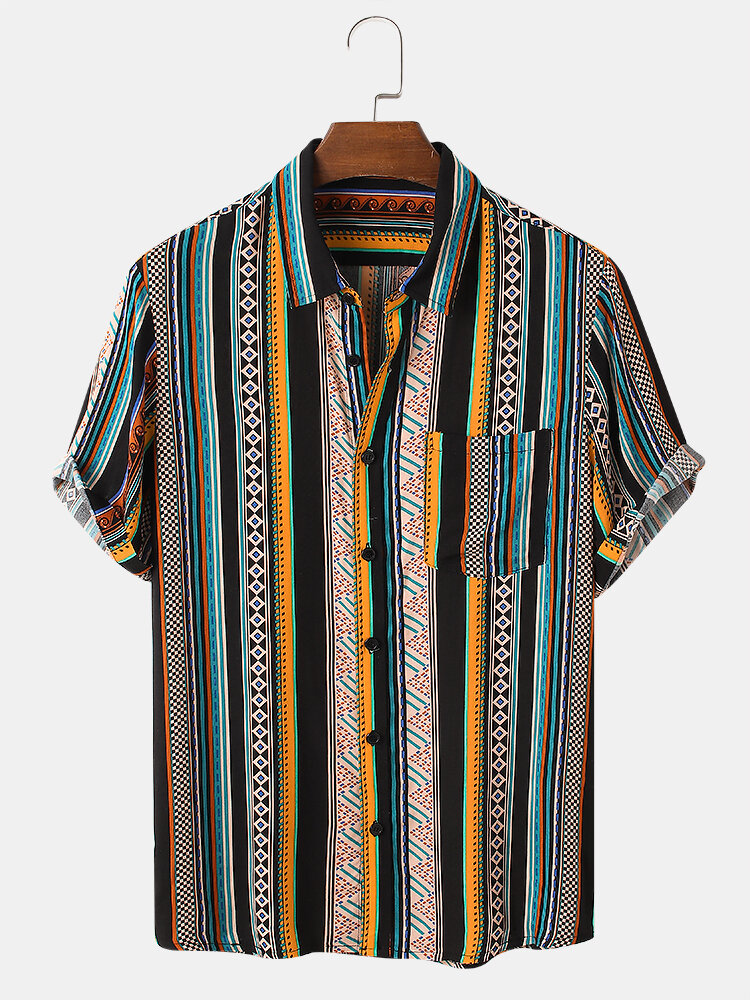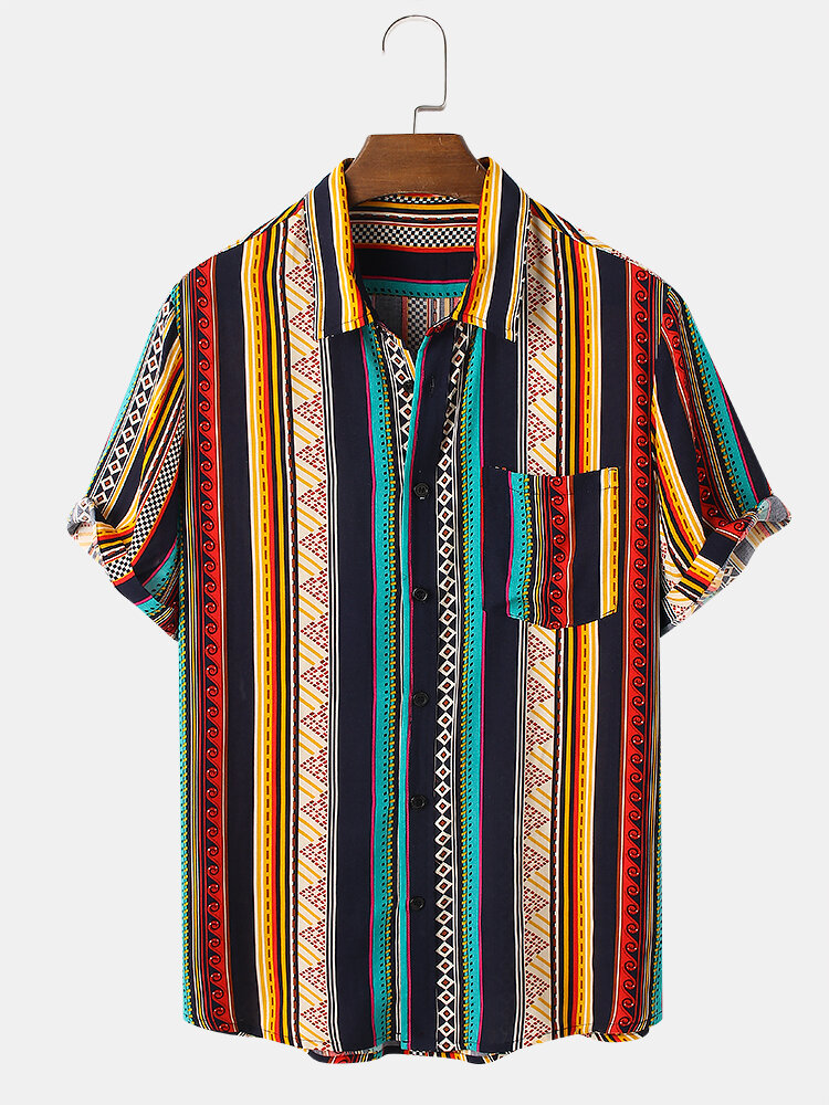 Mens Vintage Striped Print Ethnic Style Short Sleeve Holiday Shirt – Red S