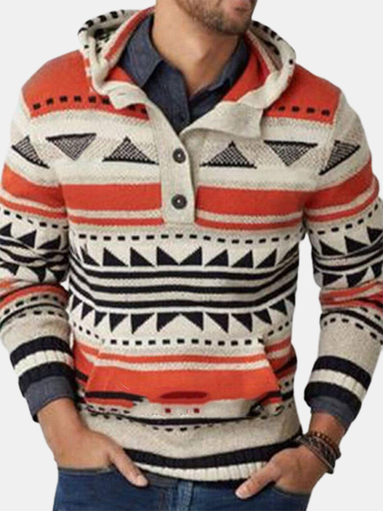 Mens Vintage Tribal Geometric Pattern Knitted Half Button Front Hoodie Sweaters – Red S