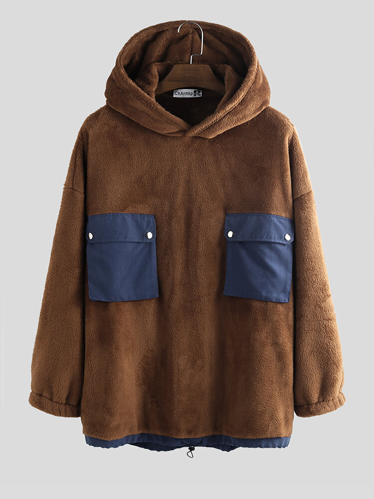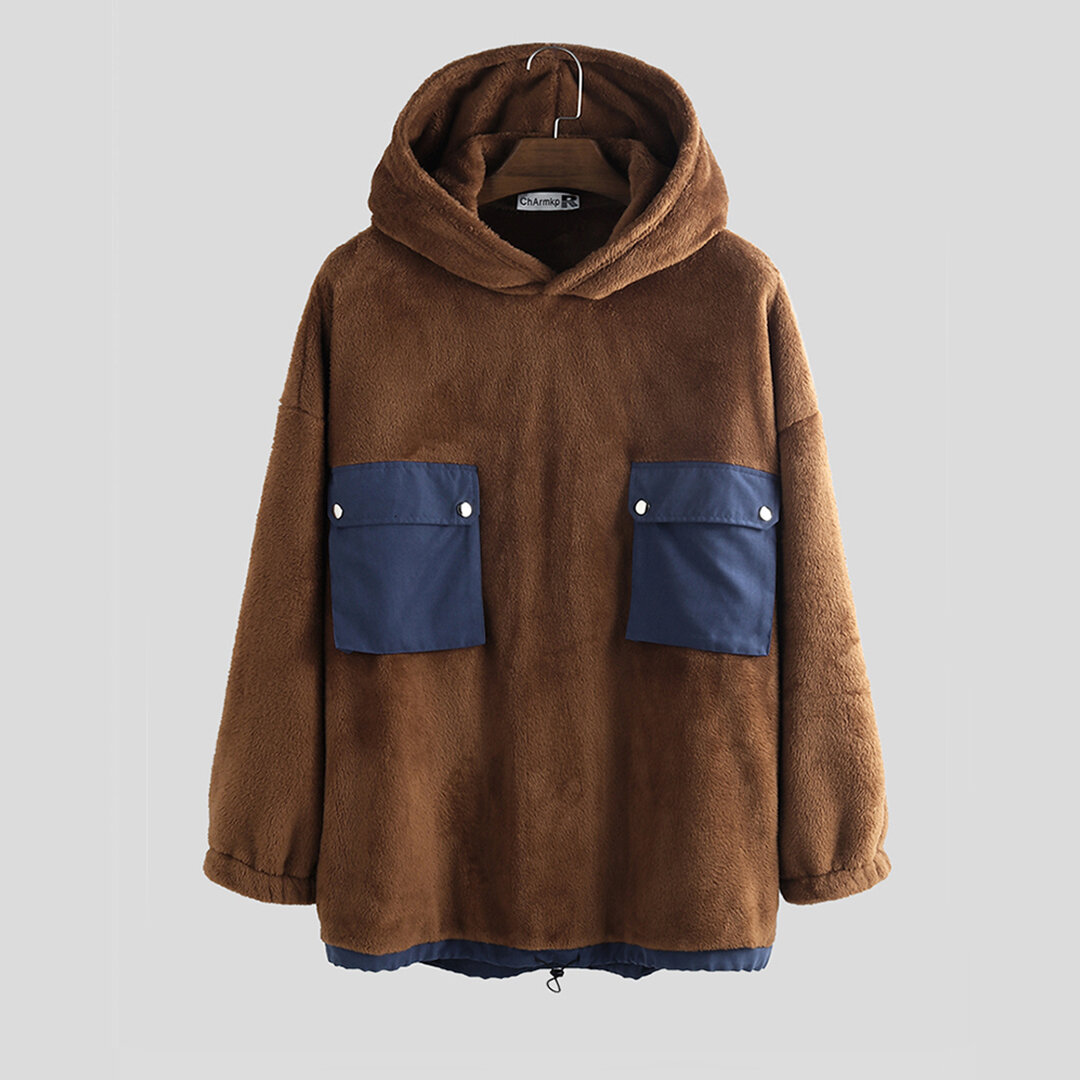 Mens Vintage Woolen Patchwork Double Pockets Hoodies – 2XL Black
