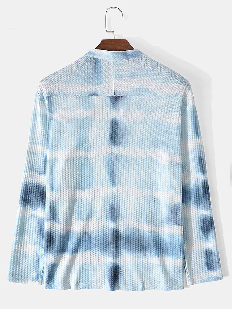 Mens Waffle Tie-Dye Print Button Long Sleeve Henley Shirt – Blue S