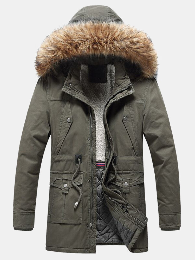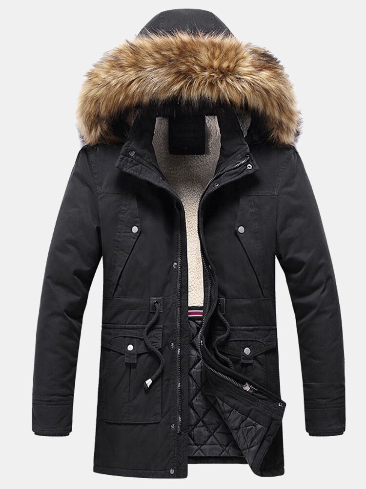 Mens Warm Solid Color Windproof Multi Pocket Detachable Faux Fur Collar Hooded Coat – M Black