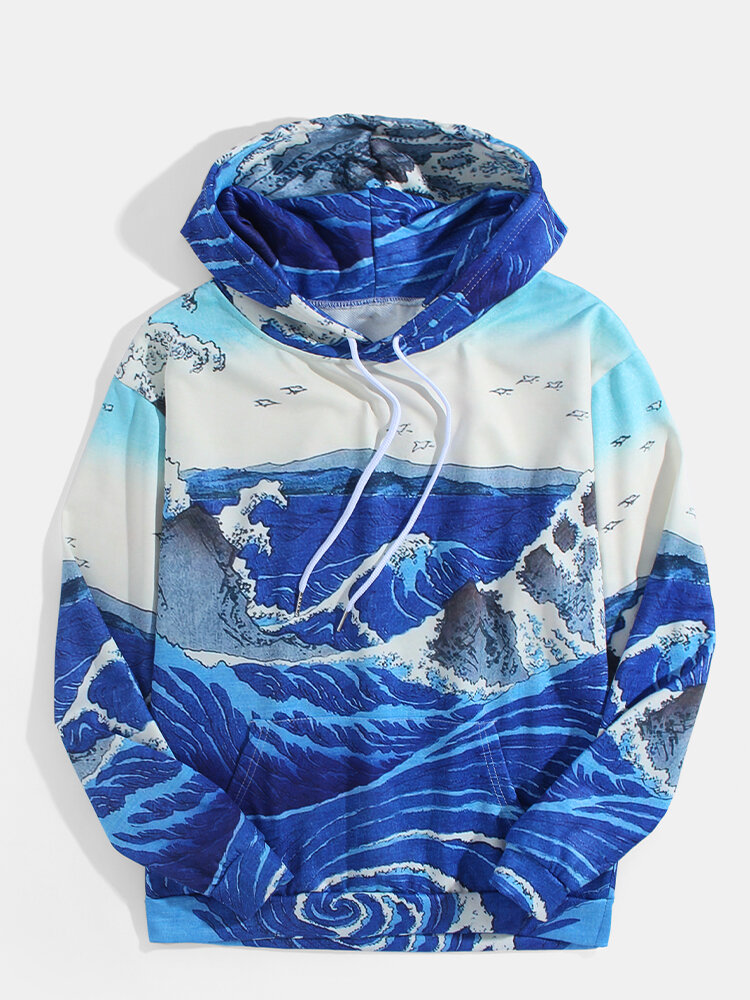Mens Wave Landscape Print Kangaroo Pocket Ukiyoe Hoodies – Blue M