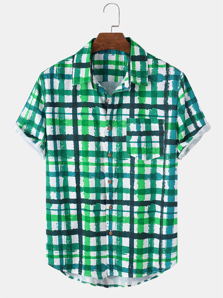 Mens Wave Srtipe Plaid Pocket Short Sleeve Shirt – Green S