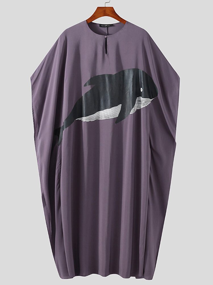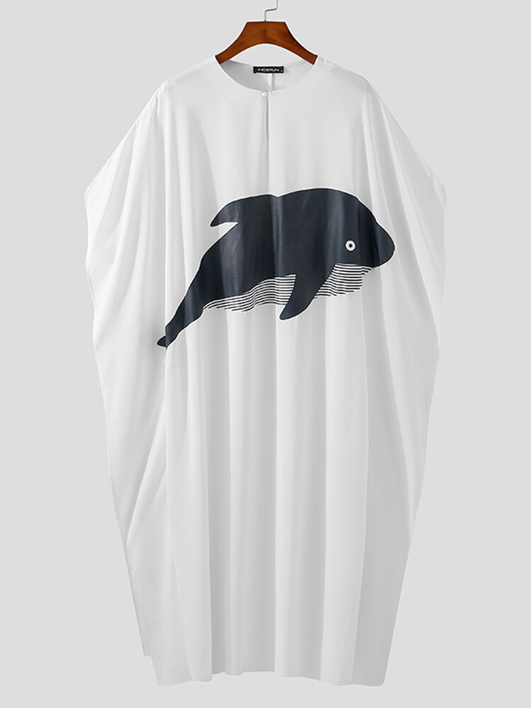 Mens Whale Print Button Neck Pullover Casual Poncho Kaftan – White S