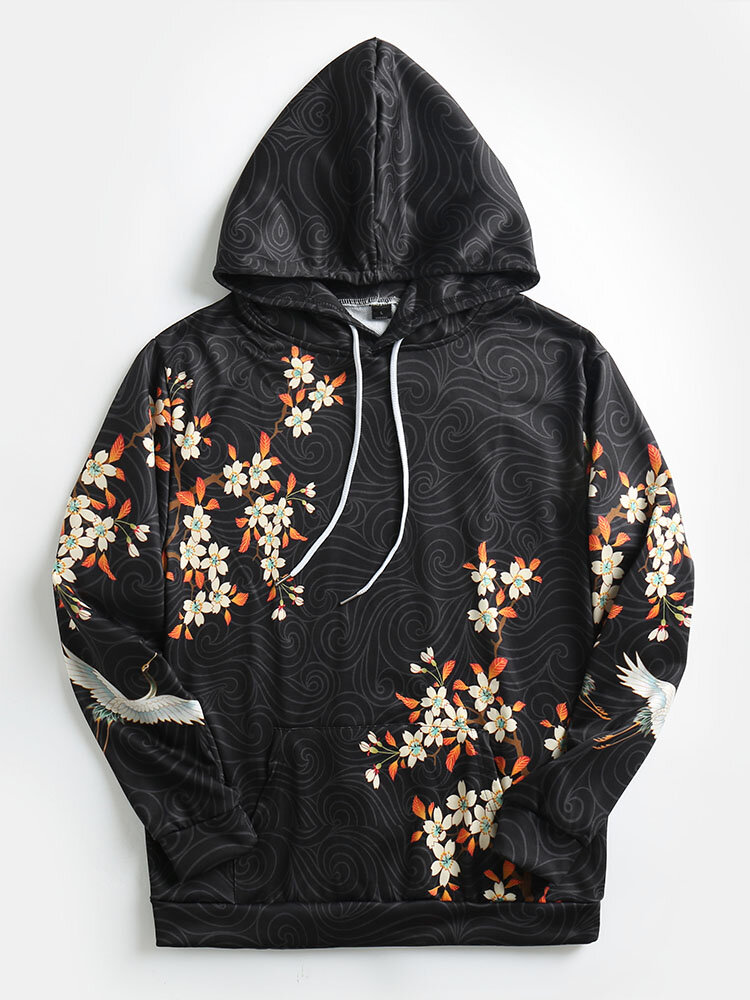 Mens White Crane Floral Printing Ethnic Style Pocket Hoodies – Black S